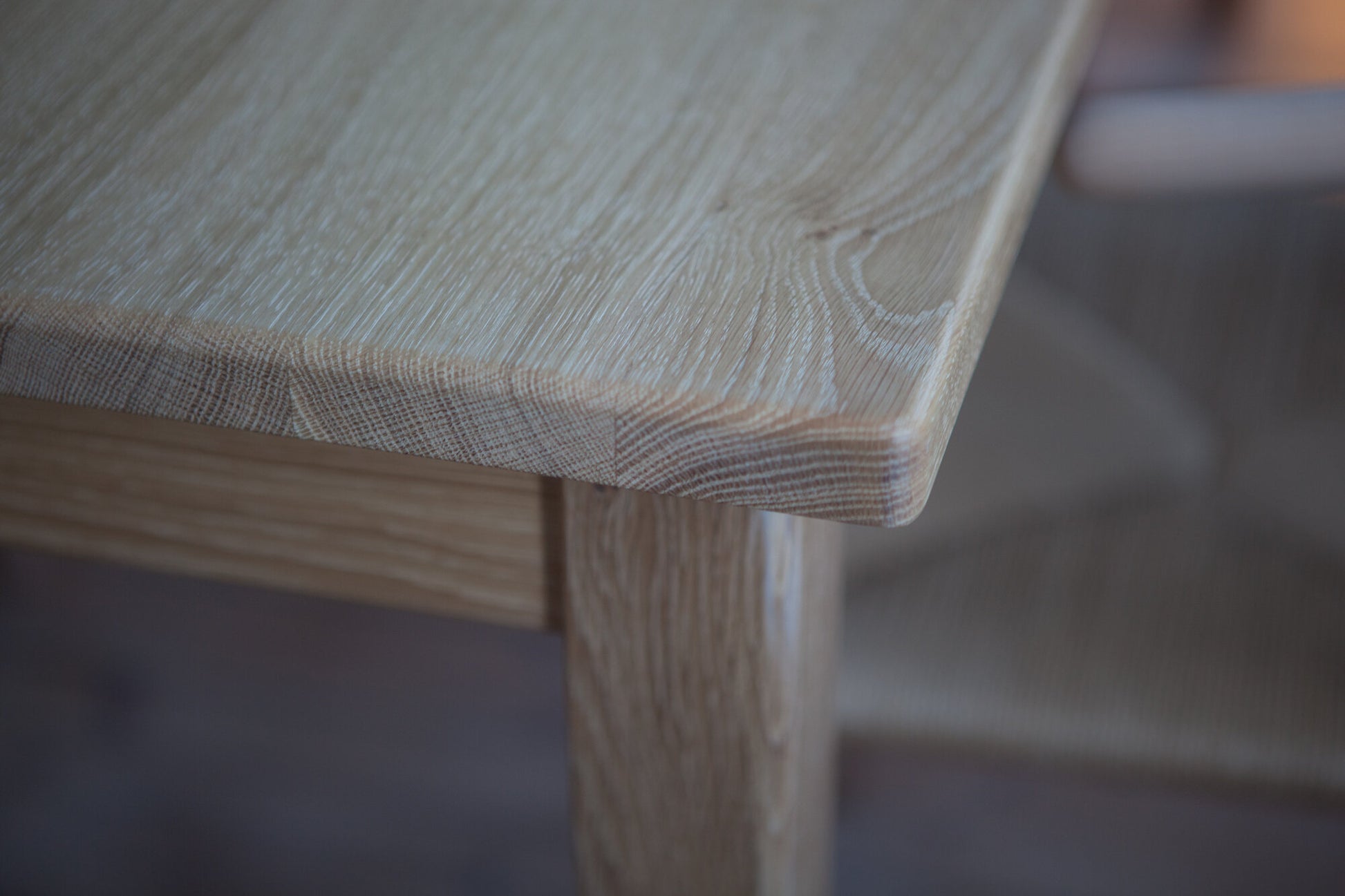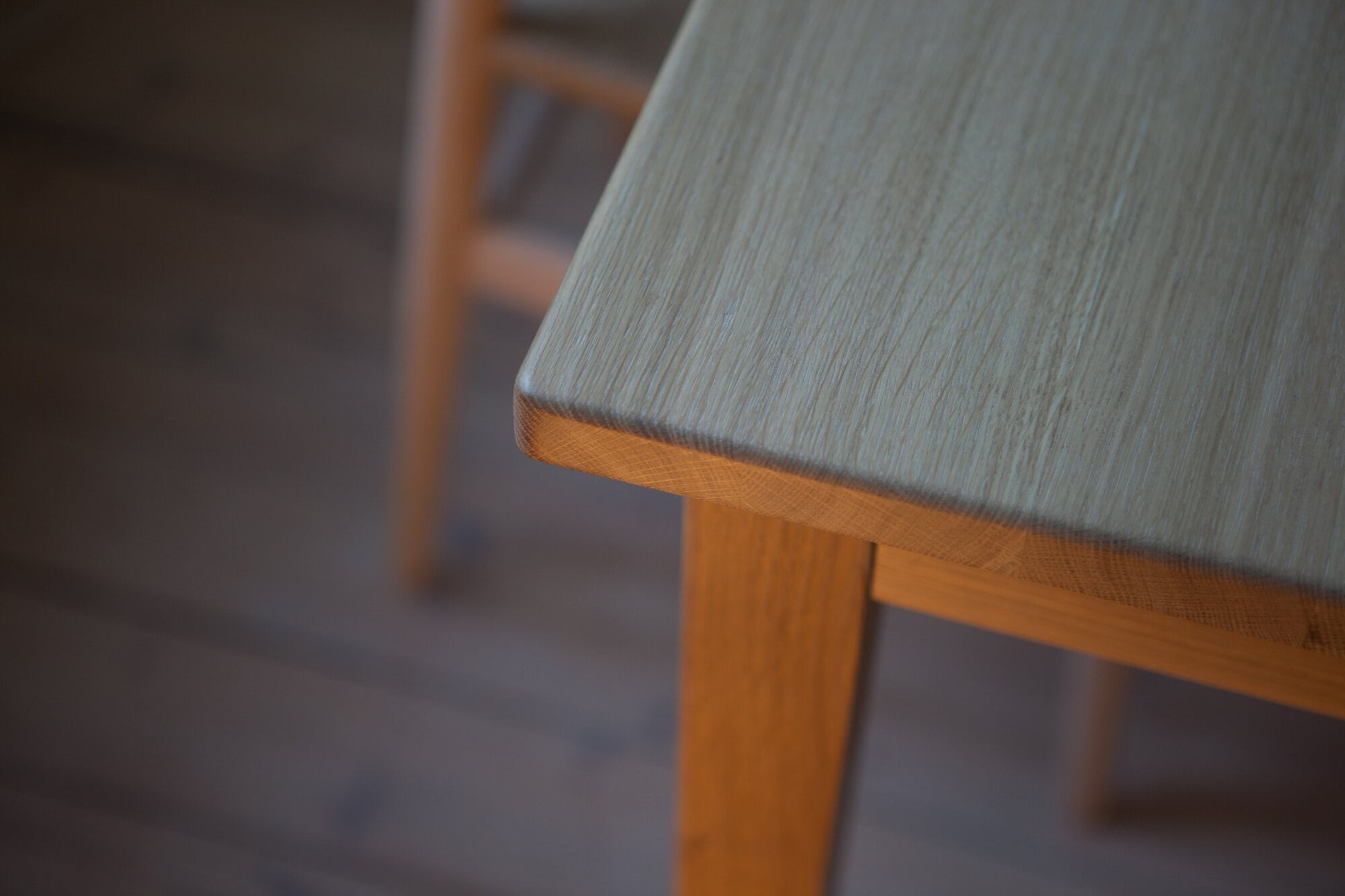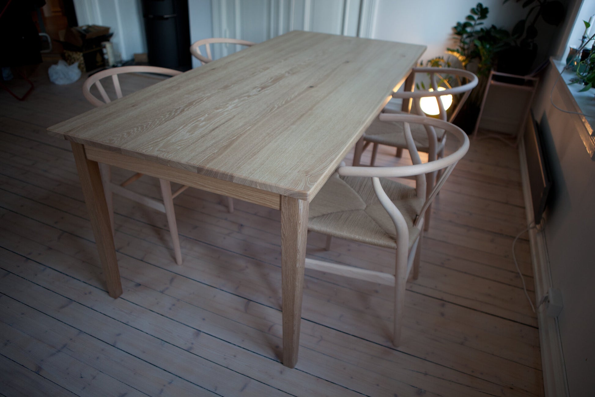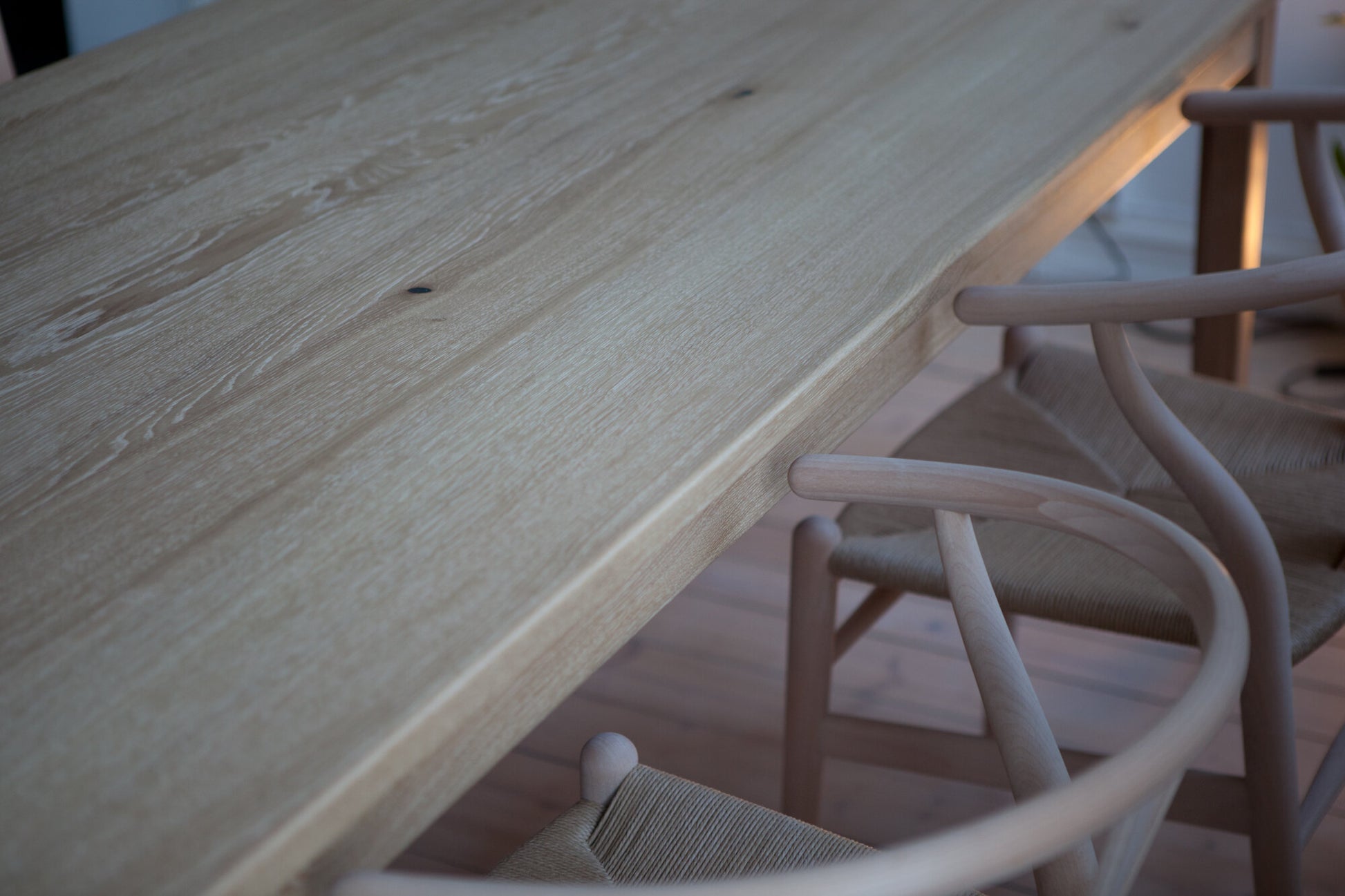 Spisebord i heltre eik. Håndlaget slik som alle våre produkter er. Bordplaten er limt for hånd der hver en "lamell" er valgt ut for å få en harmonisk sammensetning av mønster, fargetone og retning i treet som er viktig under lime-prosessen slik at platen holder seg stabil og rett under fuktighets svingninger mellom vinter og sommer.